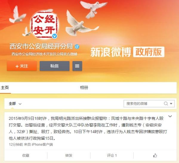 10日21点20分,西安市公安局经开分局官方微博就此发布声明:2015年9月9日18时许,我局明光路派出所接群众报警称,凤城十路与未央路十字有人殴打交警。出警后经查,经开交警大队三中队协警李刚在工作时,遭到钱杰专(安徽庆安人,32岁)撕扯、殴打,致轻微伤。10日下午14时许,违法行为人钱杰专因涉嫌故意殴打他人被依法行政拘留15日。