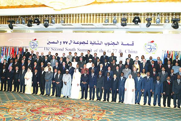 图为2005年6月15日,在卡塔尔首都多哈出席“77国集团+中国”第二届南方首脑会议开幕式的各国领导人合影。