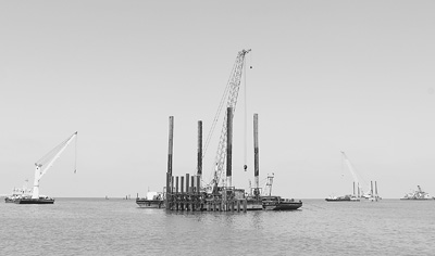 不远处的海面上,大型吊车正在进行防波堤建设,疏浚、打桩,施工有条不紊;海岸边,重型卡车运来的石块、沙土等材料堆积如山。