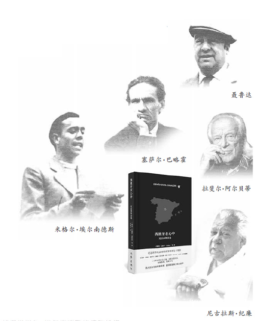 《西班牙在心中》是聂鲁达组诗的名字。1936年7月,西班牙内战爆发,一个月后,诗人的好友加西亚·洛尔卡被法西斯分子杀害,聂鲁达激愤不已,开始创作组诗,第二年在智利出版。1936年至1939年西班牙内战期间,来自54个国家的工人和进步人士为支援共和国组成志愿军国际纵队,共7支,约3.5万人,于1936年10月抵西班牙参战。1938年9月,国际纵队被迫撤出西班牙后,白求恩、柯棣华等人则辗转来到中国反法西斯战场。这是惊天地、泣鬼神的英雄壮举,是世界反法西斯史上光辉的一页。聂鲁达、阿尔贝蒂等诗人对此都给予了高度评价和热情赞扬。