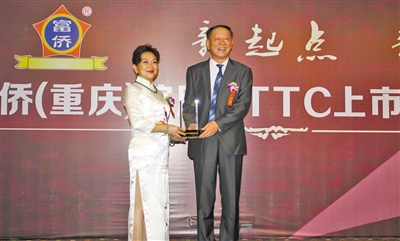 昨日发布会上,胡芝容(左)向中沐委代表赠送纪念品。 重庆晨报记者 胡杰 摄
