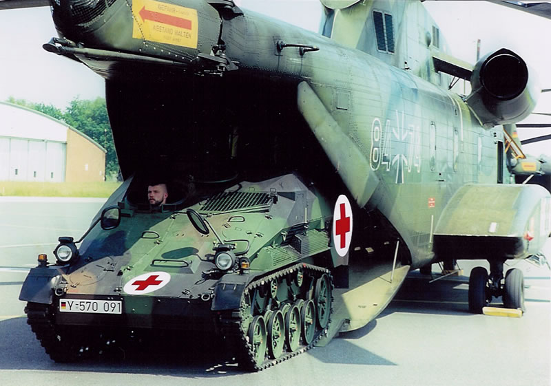 美国的CH-53系列的任务则完全不同,作为海军陆战队装备的重型运输直升机,它最初的用途就是与较小的CH-46直升机一起运输步兵部队进行垂直登陆的突击作战,其货仓主要的“货物“只有人员(包括担架)和承载给养弹药的货盘两种,最初该机的体量就比米-26小了一圈;加上作为一种舰载机,又要能够装进大型运输机,该机对高度和尺寸有着严格的限制,不仅旋翼尾撑等设备都可以折叠,机身高度只有米-26的2/3,货仓也很狭窄,很难装载各种车辆装备(只有德国为其量身定做了尺寸极小的”鼬鼠“装甲车),即使是”悍马“这样的越野车也必须使用吊挂。于此同时,由于定位于突击运输,需要能够经受粗暴驾驶,该系列直升机的动力要比米-26更加充沛,CH-53K虽然尺寸较小,但引擎总功率已经接近米-26。