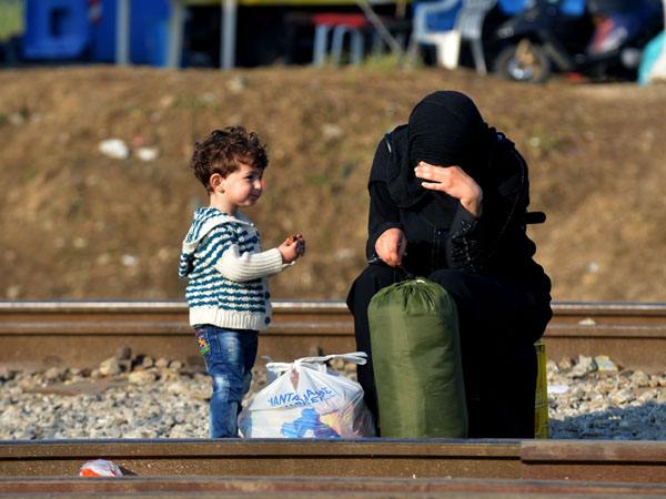 9月14日,在希腊北部与马其顿交界地区,一名难民和她的孩子等待穿越边境线。新华社/法新