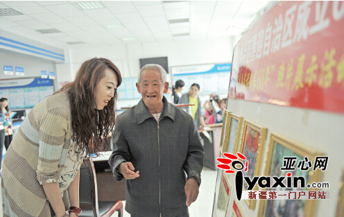 昨日,乌市南湖北路片区管委会,刘济民老人(右)给工作人员介绍照片里的家庭成员。亚心网记者豆兴军摄
