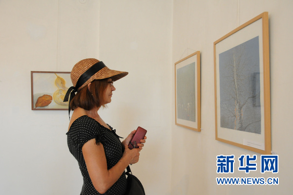 罗马尼亚市民在阿尔巴尤里亚举办的中国银川美术作品展上欣赏中国画家作品。新华社记者陈进 摄