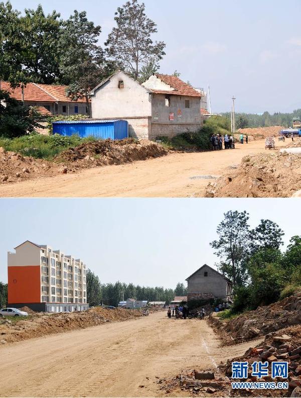 新华社照片,平邑(山东),2015年9月17日 山东平邑县一农民被烧死事件调查拼版图片:上图是死者张纪民家被烧毁的房屋,屋顶已经坍塌;下图是后东固村正在新修的马路,马路右边为张纪民家房屋(9月16日摄)。 9月14日,山东平邑县一农民在家里被烧身亡,平邑县委、县政府将其定性为“民宅火灾事故”,并于16日初步认定“火灾系死者张纪民自身行为所致”。记者在事发后赶赴当地调查,一些目击者和村民认为,“火灾”背后仍有疑惑待解。新华社记者周科摄