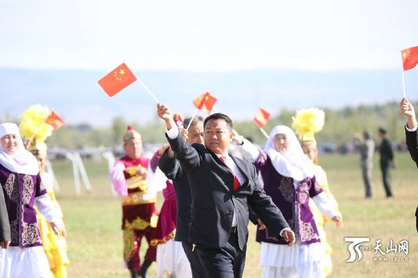 天山网讯(特约记者刘是何摄影报道)9月16日上午,新疆哈巴河县干部群众正舞动着手中的五星红旗。当天,在哈巴河县庆祝自治区成立六十周年大会暨第二届“金秋桦林艺术节”活动中,当地千余名干部群众舞动着手中的五星红旗,祝福祖国更加强大,庆祝自治区成立六十周年,祝福新疆的明天更加美好。