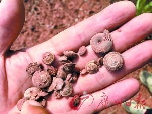 这些化石究竟有多少?经过片刻的寻找,赵先生在该处山冈的地上就拾获了10余颗类似的化石。记者看到,这些化石直径一般为1至2厘米,与我们平时看到的蜗牛相像,但仔细观察又有一些差异,部分“蜗牛壳”有一些特别的纹理。