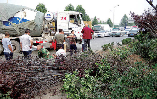 记者赶到现场时,水泥罐车已经被扶正。该车右前车头留有明显撞击痕迹。绿化带内约10米长的树木遭到破坏。