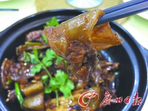 焖得软软的水鱼骨,薄而透明的鱼胶,咬一口软滑温润,酱香味十足。这款传统的水鱼煲,采用3斤多的野生水鱼骨、鱼腩、头和脚,先飞水、油后,去掉泥腥味,再加上新鲜的土鸡肉和秘制的酱料,放入陶瓷瓦煲中用小火焖上40多分钟才熄火收汁。此时水鱼骨早已“傲骨”不存,被焖得温软了许多,咬一口软中带硬,嚼起来喀嘣喀嘣的,像吃鱼翅一样。鱼腩则由于吸足了鸡肉和酱汁的香味,吃起来有点像鱼胶。