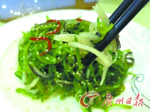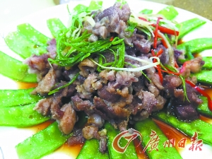 薄如蝉翼的水鱼裙边,是整只水鱼的精华部分,水鱼的裙边不足二两,用薄薄的片刀将其切成细丝后,浸入80~90℃左右的滚水中烫熟即捞出过冷河,将荷兰豆切丝后也同样捞熟过冷河,再将两者加入调味料一起凉拌,薄而透明的水鱼丝掺杂在青嫩嫩的荷兰豆中,显得特别不起眼,不过入口细尝,就会发现在荷兰豆的清新中,会间杂着水鱼裙的爽脆,丝丝缕缕,若有若无,犹如凉风细雨般,为荷兰豆增添了几许韵味和层次。淡淡的麻油香味伴随着荷兰豆的清香味溢出,隐隐约约还有一丝青芥茉的鲜味入口十分清新,美中不足的是味道有点偏咸。