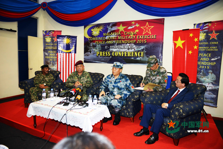 当地时间9月18日11时,“和平友谊-2015”中马首次实兵联演开始仪式在马来西亚雪兰莪州梳邦空军基地举行,标志着中国与东盟国家举行的规模最大的双边联合军事演习正式拉开帷幕。图为开幕仪式后的记者会。孙利摄