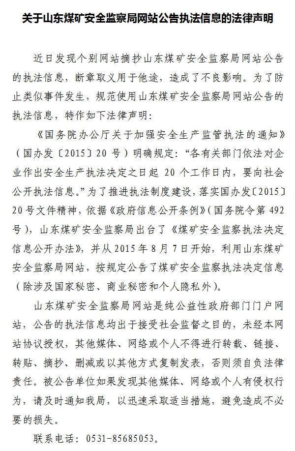 煤监局亦在官网显眼位置发出法律声明,指责“个别网站摘抄山东煤矿安全监察局网站公告的执法信息,断章取义用于他途,造成了不良影响”。声明称,山东省煤监局网站是纯公益性政府部门门户网站,公告的执法信息均出于接受社会监督之目的,未经本网站协议授权,其他媒体、网络或个人不得进行转载、链接、转贴、摘抄、删减或以其他方式复制发表,否则须自负法律责任。