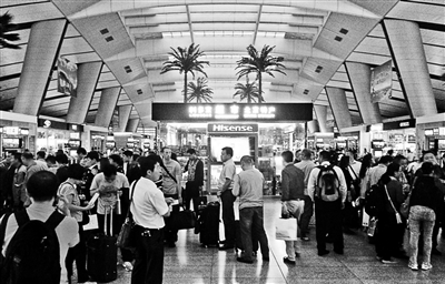 在距离老人不远的乘客座位上,早已坐满了人,检票口与检票口中间商店周围的长椅子和星巴克、肯德基等消费区域,也已经被等待检票进站的乘客“占领”,一位在星巴克消费的乘客告诉北京青年报记者,喝咖啡是次要的,主要是为了有个座位可以消磨时间。