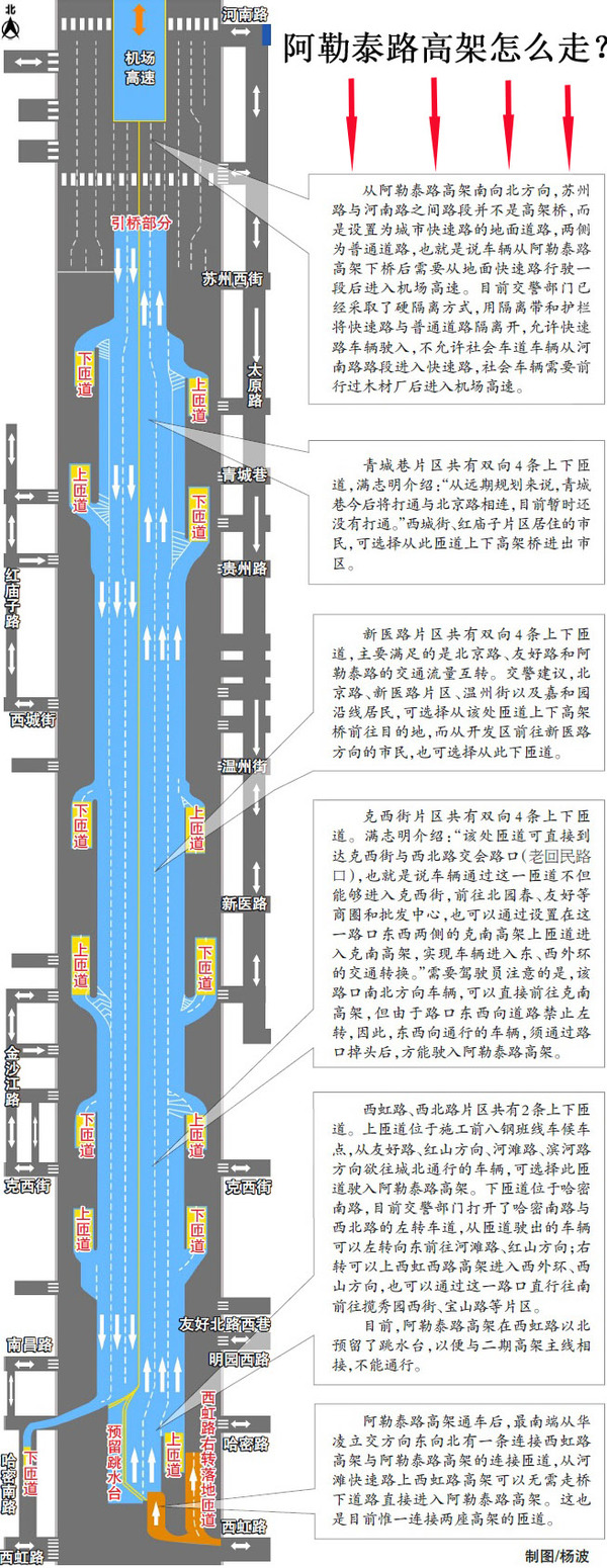 记者了解到,阿勒泰路高架全线基本为双向4至6车道。新建7对上下匝道,共14条。同时,改扩建1条西虹路东向北右转落地匝道和1条西虹路东向北立交(西虹路高架桥梁连接新建高架桥梁)匝道。匝道也分为2车道和单车道,请市民驾驶时注意。