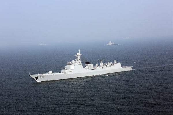 9月19日,“和平友谊-2015”中马实兵联演在马六甲海峡中部海域举行联合护航演练,中马双方舰艇组成护航编队。新华社发(刘伟 摄)
