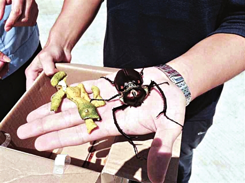 海都讯 昨天上午,邵武市民汤先生捧着一个纸盒急匆匆来到吴家塘森林公安派出所,“你们看看,这是不是保护动物?”民警打开盒子,只见里面是一只巨大的甲虫,“全身呈现墨绿色,体形椭圆,背面隆拱,前足特别长,头部较小,侧缘锯齿形。”民警测量了一下,这只甲虫体长达到近14厘米,外观十分威武。