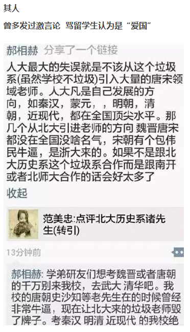 北京青年报(微信ID:beijingqingnianbao)记者注意到,网上流传出的郝相赫朋友圈截图显示,他多次在朋友圈里转发评论学界的前辈,涉及历史学界的国内多所知名院校。如“人大最大的失误就是不该从这个垃圾系引入大量的唐宋领域老师……如果不是跟北大历史系这个垃圾系合作而是跟南开或者北师大合作的话好太多。”“想考魏晋或唐朝的千万别来我校,去武大清华吧。”这些激烈的措辞让网友直呼名校躺枪。