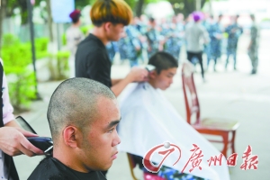 刚刚过去的两天可能是正在军训的是东莞理工学院大一男生日后难以忘记的日子。因为整个军训团33个连的男生每个人都交了10元钱,让学校从外面请来的理发师把他们头上时尚前卫的发型统一换成了小平头。