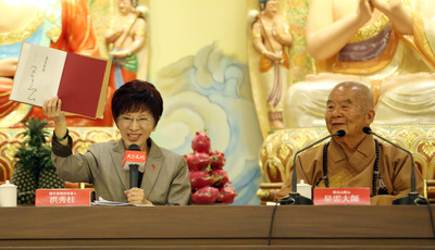 据报道,星云法师21日下午在佛光山台北道场举行新书发表会,洪秀柱会前先与星云大师会面,接着洪秀柱扶着星云法师的轮椅一同进场;远见天下文化事业群创办人高希均也出席,他说,此书收录星云近60几年来最重要的100篇文章。
