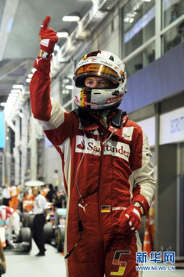 9月20日,维泰尔在车房外庆祝夺冠。当日,在新加坡滨海湾街道赛道举行的2015F1新加坡夜间大奖赛中,法拉利车队车手维泰尔夺得冠军。 新华网发(邓智炜摄)