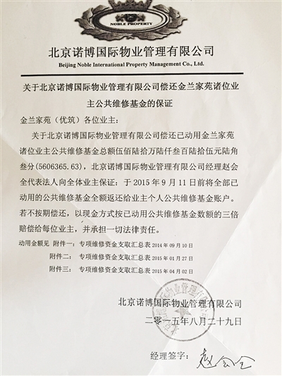 昨日,涉事的北京诺博国际物业管理有限公司新任经理孙怀刚表示,由于缺乏经验,此前工作确有漏洞,目前正在退回动用的资金。