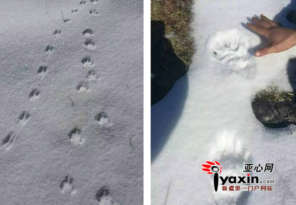 昨日,小张传来两张雪地里的足迹照片,说是半个月前一游客在黑湖附近拍到的,该照片经中科院新疆生地所研究员马鸣鉴定,脚印小的为狼的足迹,脚印大的为熊足迹。图/游客提供