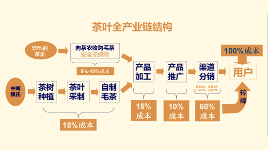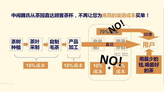 中闽魏氏一直在思考:如何为客户创造更高的价值,如何为天下茶人呈上性价比最高的茶叶。通过不断的实践和详细的调查,魏氏重新梳理了茶产业各环节的价值链,发现如今世面上的茶企实体直营店的渠道成本投入太高,装修、租金、工资、运营费占到产品销售收入的60%,也就是顾客每购买100块钱茶叶产品有60块和顾客的产品价值无关!如果停止开设实体直营店,节约下来的成本是不是可以回报到顾客的手中?魏氏敢想敢干,及时做出了战略调整,重新制定经营策略,立即停止开设实体直营店,并计划用三年半的时间完成渠道优化和转型,从原来的118家实体直营店关至现在的20家。