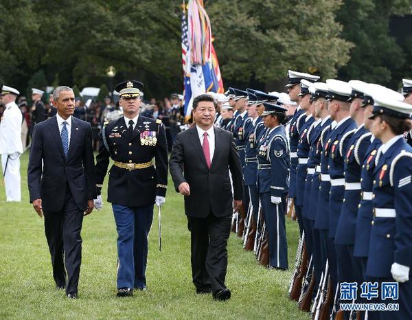 9时许,习近平和夫人彭丽媛乘车来到白宫南草坪,在下车处受到奥巴马和夫人的热情迎接。在奥巴马陪同下,习近平走进欢迎区,沿着红地毯走上检阅台。乐队奏响中美两国国歌,礼炮鸣21响。习近平在奥巴马陪同下检阅了仪仗队。身穿传统军服的军乐队吹响笛子和军号,鼓乐齐鸣,齐步走过检阅台,接受检阅。欢迎人群挥舞中美两国国旗向习近平欢呼致意。习近平同站在前排的代表亲切握手,向他们问好。