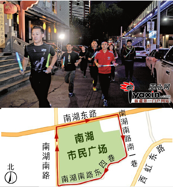 亚心网讯(记者代筱晔)9月24日,一群头戴鲜艳假发和发光发箍的年轻人,手持荧光棒围绕着南湖广场跑了一整圈,跑动中,他们举着一条横幅,这群热爱运动的夜跑族用这种方式庆祝新疆维吾尔自治区成立60周年。
