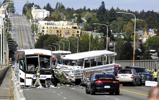 车祸发生在当地时间上午11时15分左右,现场是华盛顿州第99号高速公路一座桥梁,一辆水陆两用观光游览车并线时失控,撞击逆向车道一辆大客车的侧面,殃及另外两辆运动型小车。