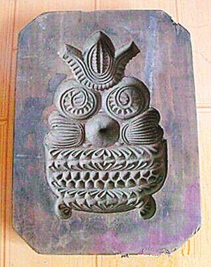 事实上,月饼模子上的图案并非“小黄人”,而是一只盛满果实的箩筐,“小黄人”的头发其实是玉米,眼睛是两只石榴,鼻子是一只桃子,脸颊像是两棵白菜,它的大肚子,便是箩筐,箩筐下面是提供支撑的腿。吃月饼的时节是中秋,中秋的时候,正值秋收的季节,瓜果飘香、丰收在望,所以,这块月饼模具寓意为五谷丰登、瓜果满园。 (黑王辉)