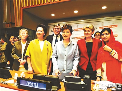 中国第一夫人彭丽媛(左二)和秘书长夫人柳淳泽、韩国总统朴槿惠、教科文组织总干事博科娃以及英雄少女马拉拉等出席“教育第一”高级别会并发言供图/联合国官方微博