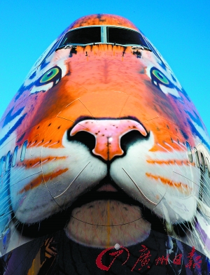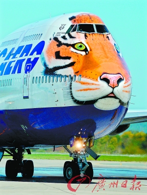 广州日报讯 当地时间2015年9月26日,俄罗斯符拉迪沃斯托克全禄航空公司一架波音747-400飞机正面喷绘东北虎形象以迎接老虎日。