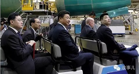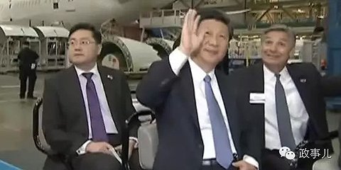与上述“主席警卫”出现在波音公司厂房里的电瓶车上一样,习近平身后的第三排坐着的就是秦刚。画面显示,秦刚坐在习主席后面,手拿一个红色的笔记本状东西。而在这之前,习近平抵达波音公司时,秦刚站在最前面为习近平介绍波音公司高层。