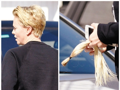 在《疯狂麦克斯》中剃光头的查理兹·塞隆好容易长长了头发,近日她又将头发剪短,留一缕金丝自己保存。