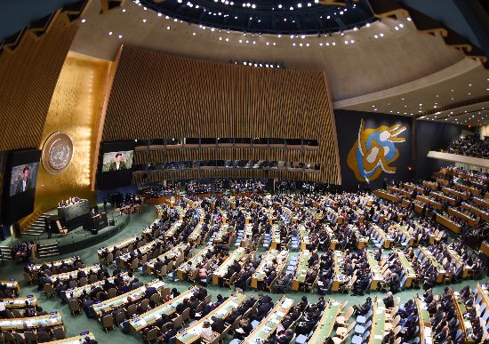 当地时间9月28日,国家主席习近平在纽约联合国总部出席第70届联合国大会一般性辩论并发表重要讲话。新华社记者王晔摄
