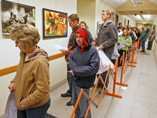 美国犹他州普罗沃一家诊所,家长带孩子排队接种供不应求的甲型H1N1流感疫苗。 George Frey/摄