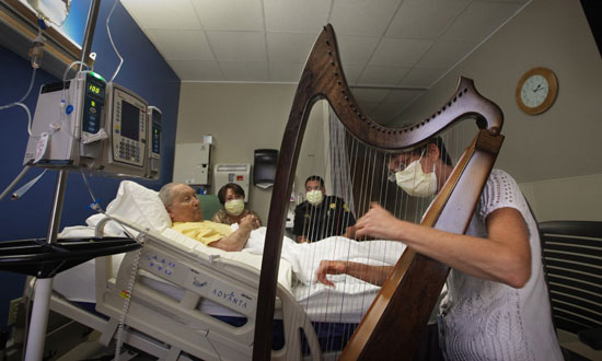 美国哥伦比亚,一位音乐家在病房为身患急性白血病的病人演奏竖琴,以减轻病痛。Tim Dominick/摄