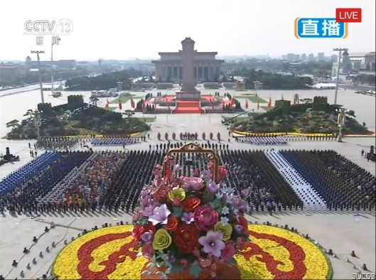 天安门广场,红旗招展,鲜花吐蕊。广场中央,主题为“祝福祖国”的巨型花篮,寓意平安吉祥、和谐安康。广场南侧,专门为中国人民抗日战争暨世界反法西斯战争胜利70周年庆祝大会搭建的大型长城主题花坛,展现出祖国壮美山河的动人画卷。约3000名首都各界代表手持鲜花,面向人民英雄纪念碑列队肃立。他们中有白发苍苍的老战士、老同志,有光荣的烈士亲属,有正在中央党校学习的200多位县委书记,也有朝气蓬勃的青年学生和少年儿童。