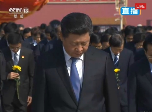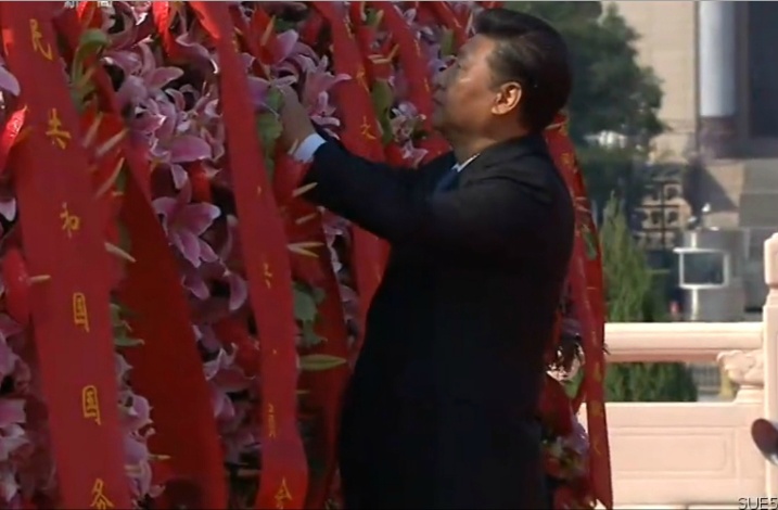 十八大后的第一个国庆,习近平、李克强、张德江、俞正声、刘云山、王岐山、张高丽等党和国家领导人于2013年10月1日10点前,冒着细雨步行来到天安门广场中央,出席向人民英雄纪念碑敬献花篮仪式。