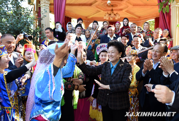 9月29日,中共中央政治局委员、国务院副总理、中央代表团副团长刘延东率中央代表团分团在伊犁哈萨克自治州看望慰问各族干部群众。这是刘延东在伊宁市汉宾乡发展村考察慰问时与表演维吾尔族传统歌舞“麦西来甫”的村民们交流。新华社记者张领摄