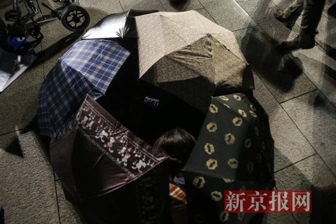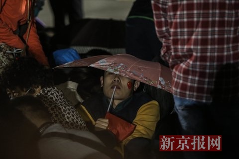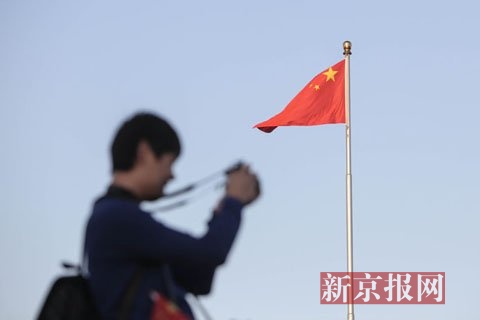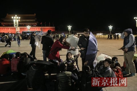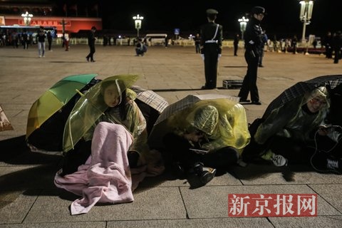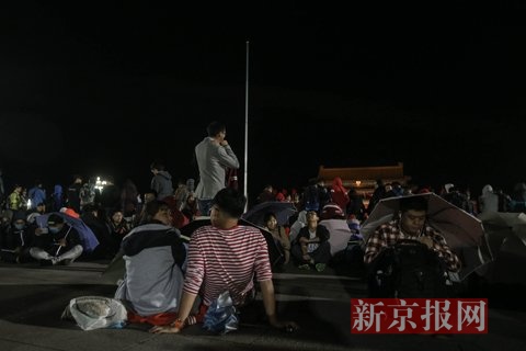 10月1日凌晨,人们在天安门广场等待看升旗。北京气象台30日下午16时30分发布大风蓝色预警,1日凌晨气温13℃,风力达5至6级,阵风达8级,伴有小到中雨。太阳升起后,天气回暖,能见度较好。新京报记者 彭子洋 摄影报道