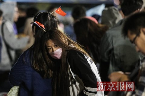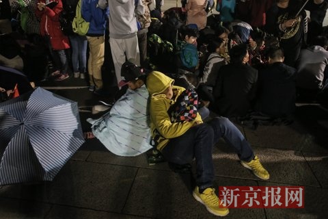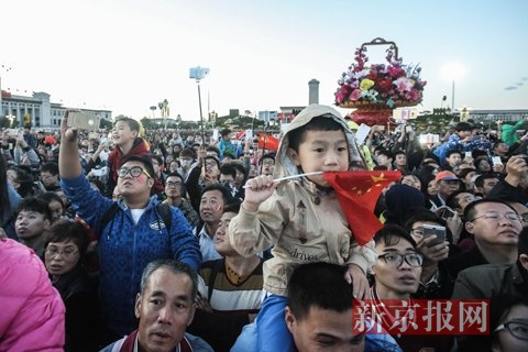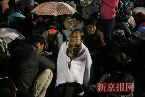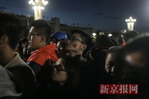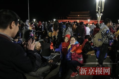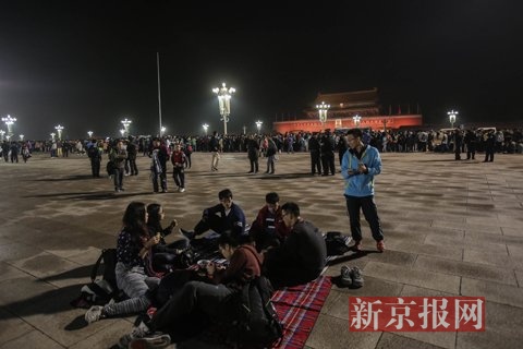 国庆节凌晨人们在天安门广场等待看升旗仪式