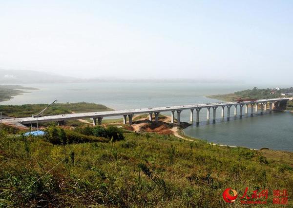 人民网十堰10月2日电 9月30日,湖北省十堰市郧阳区郧府大道清凉寺大桥全线合拢,建桥工人转向桥面施工。清凉寺大桥于2014年12月26日开工建设,全长560米,宽27米,双向6车道,设计时速为每小时60公里,是郧阳区至"郧十"高速公路联接线中最大的桥柒梁,大桥全线贯通向国庆献礼。(周家山)