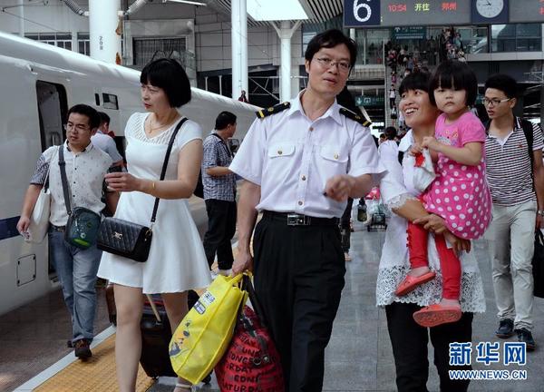 10月1日,福州火车站工作人员(中)护送一位抱着小孩的旅客上车。当日是国庆黄金周第一天,福州火车站迎来客流高峰。南昌铁路局福州客运段职工坚守岗位,为旅客提供温馨的出行服务。 新华社记者张国俊摄