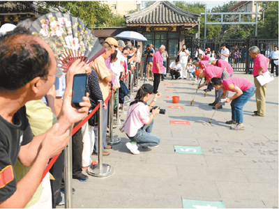 地书,不用纸墨,用水在地上书写,故称之为地书。自上世纪90年代起,地书就已经流行于陶然亭公园。为了增加比赛的观赏性和趣味性,本次地书比赛增添了“双手书写绘画表演”和“空心字表演”,吸引了众多老年朋友来展示书法。![]()