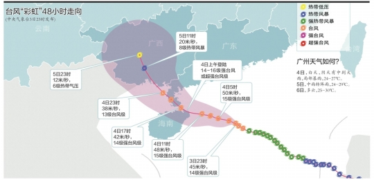 据监测,昨日晚8时,“彩虹”中心位于湛江市东南方约390公里的南海海面上,中心附近最大风力13级(38米/秒)。预计,“彩虹”将以20公里左右的时速向西偏北方向移动,将于4日早晨到下午在电白到海南琼海之间沿海地区登陆,最大可能在雷州半岛登陆。
