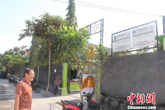 庞廷国指着校园围墙上挂着2块写有“海南大众幼儿园”“海南大众小学”的招牌说,十年前2005年,巴厘海南同乡会刚刚成立,就在这条小巷的简陋会所里,开设了一间免费幼儿班。 顾时宏 摄