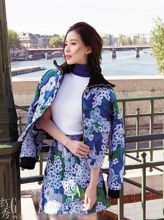 刘诗诗延续小清新风格,身穿2015Carven秋冬系列,碎花半裙十分减龄。
